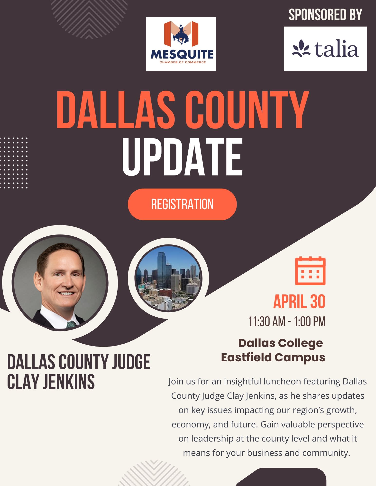 URL:https://mesquitechamberofcommercetx.growthzoneapp.com/chamber-events/Details/april-monthly-luncheon-dallas-county-update-with-judge-clay-jenkins-1583250?sourceTypeId=Hub
